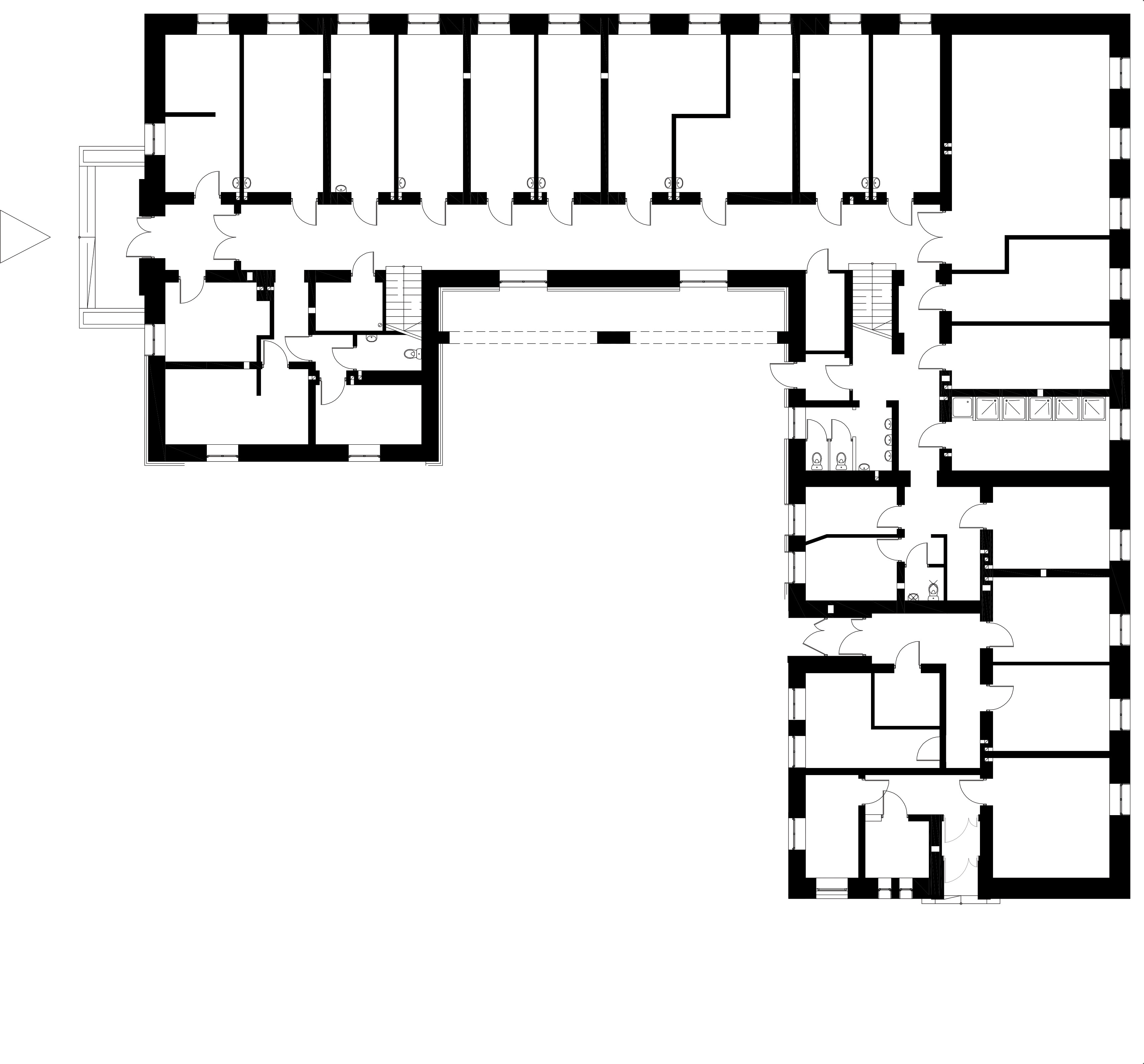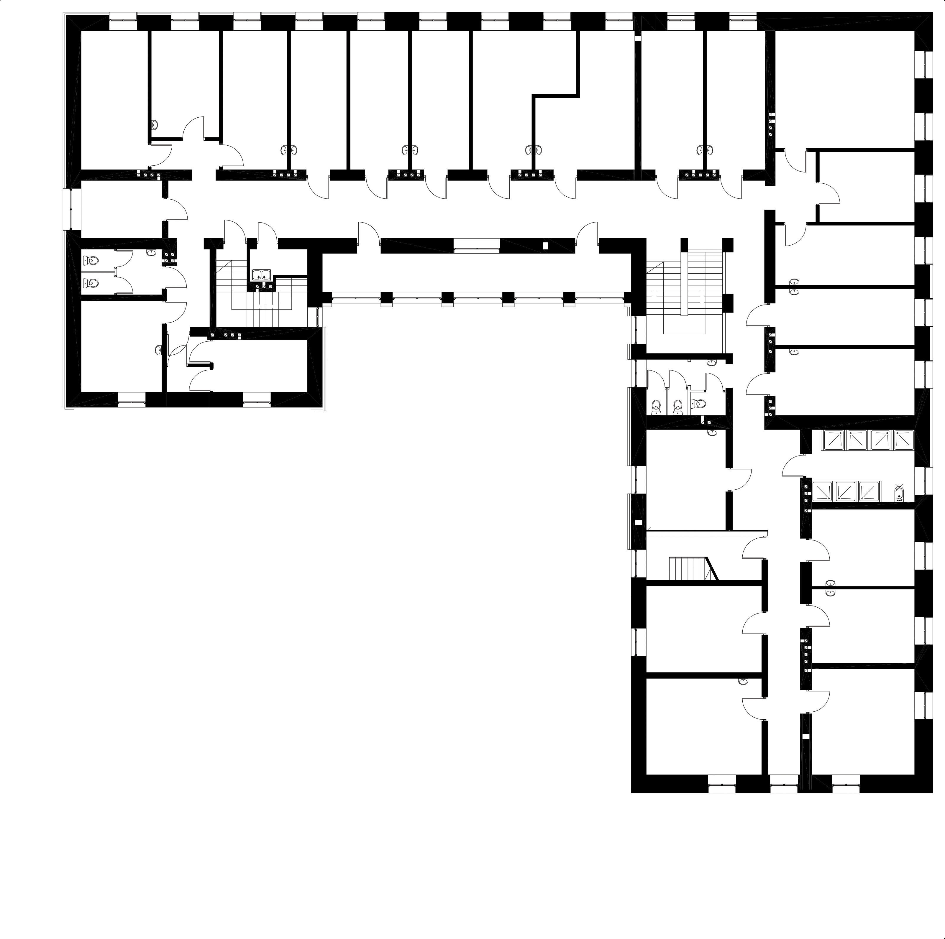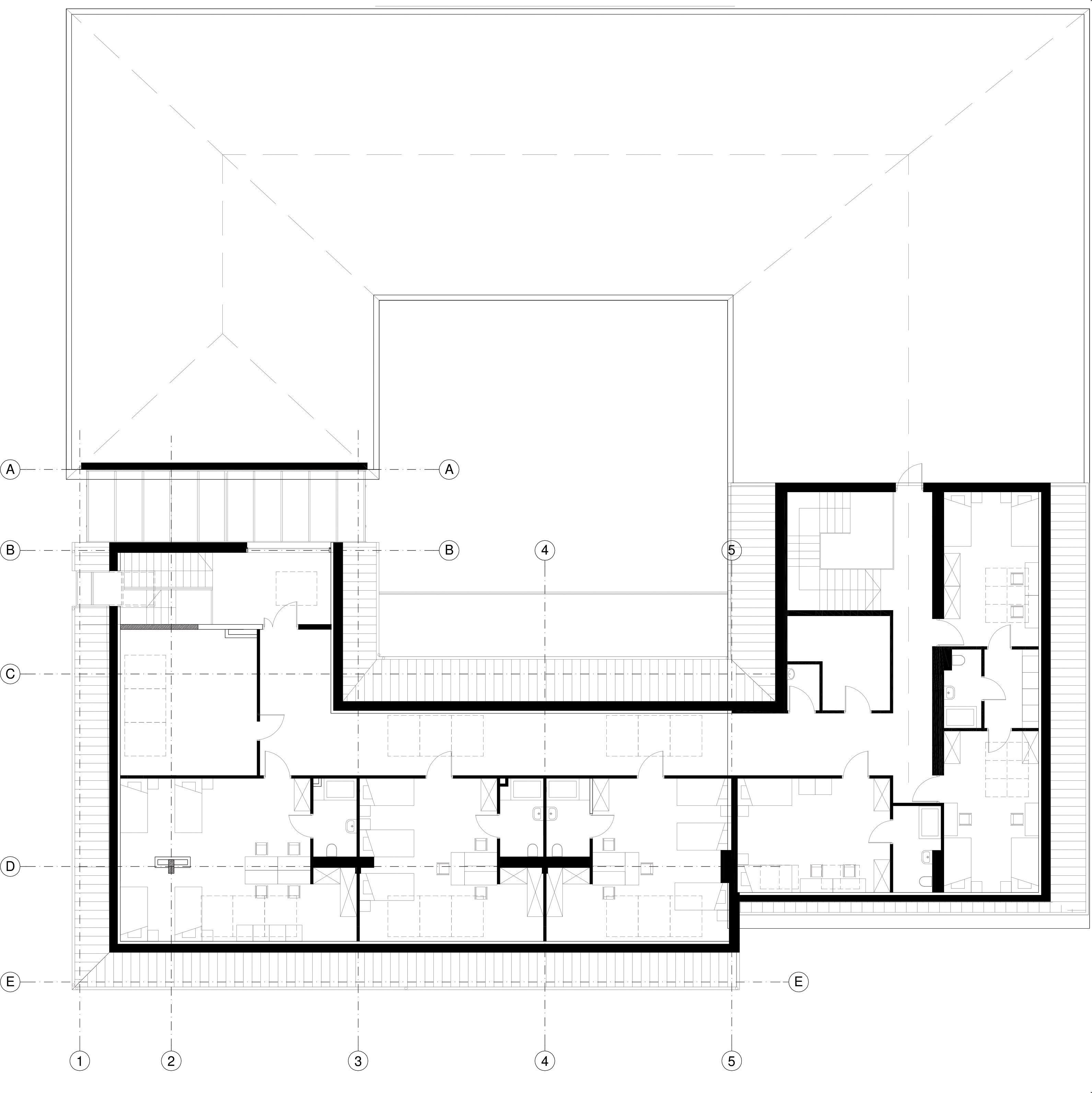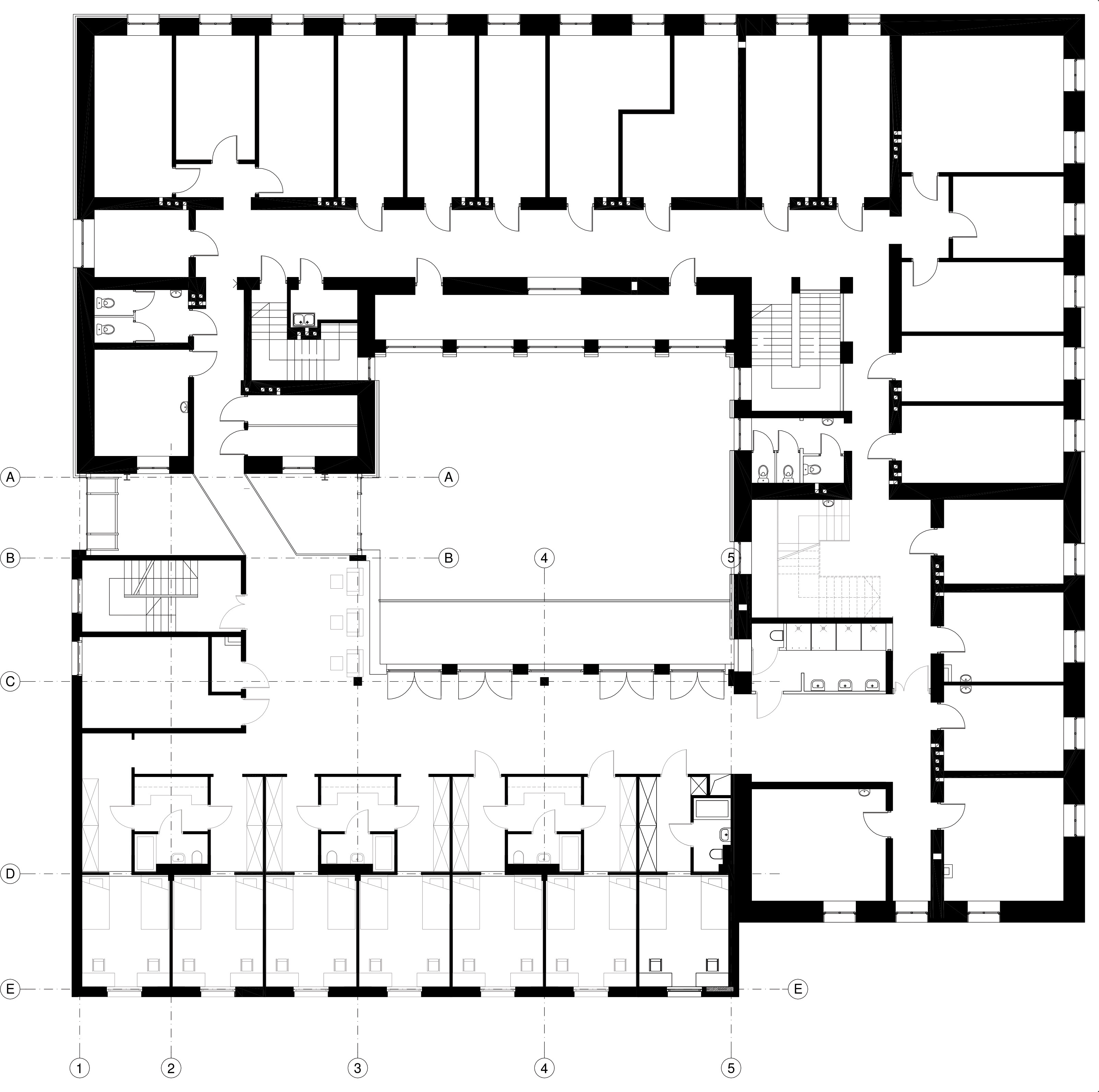 Poziom parteru zajmuje głównie stołówka wraz z całym zapleczem kuchennym i dodatkowymi pomieszczeniami administracyjnymi. Uczniowie mają do dyspozycji dziedziniec na którym w okresie letnim mogą wykorzystywać na odpoczynek bądź naukę. Na poziomie piętra znajdują się pokoje dla uczniów oraz pomieszczenie do cichej nauki. Szeroki korytarz na którym zaproponowano miejsca do siedzenia ma pomagać w lepszej integracji. Do dyspozycji jest taras, który ma spełniać podobną funkcję jak dziedziniec. Z uwagi na wysokie poddasze jakie budynek posiada wykorzystano ten aspekt w nowej części i zaprojektowano trzecią kondygnację. Tym samym zwiększono liczbę pokoi i dodano pomieszczenia socjalne oraz kolejne pomieszczenie do cichej nauki. Dodatkowo w narożnej części istniejącego budynku powtórzono ten zabieg i uzyskano trzy pokoje wraz z klatką schodową.
