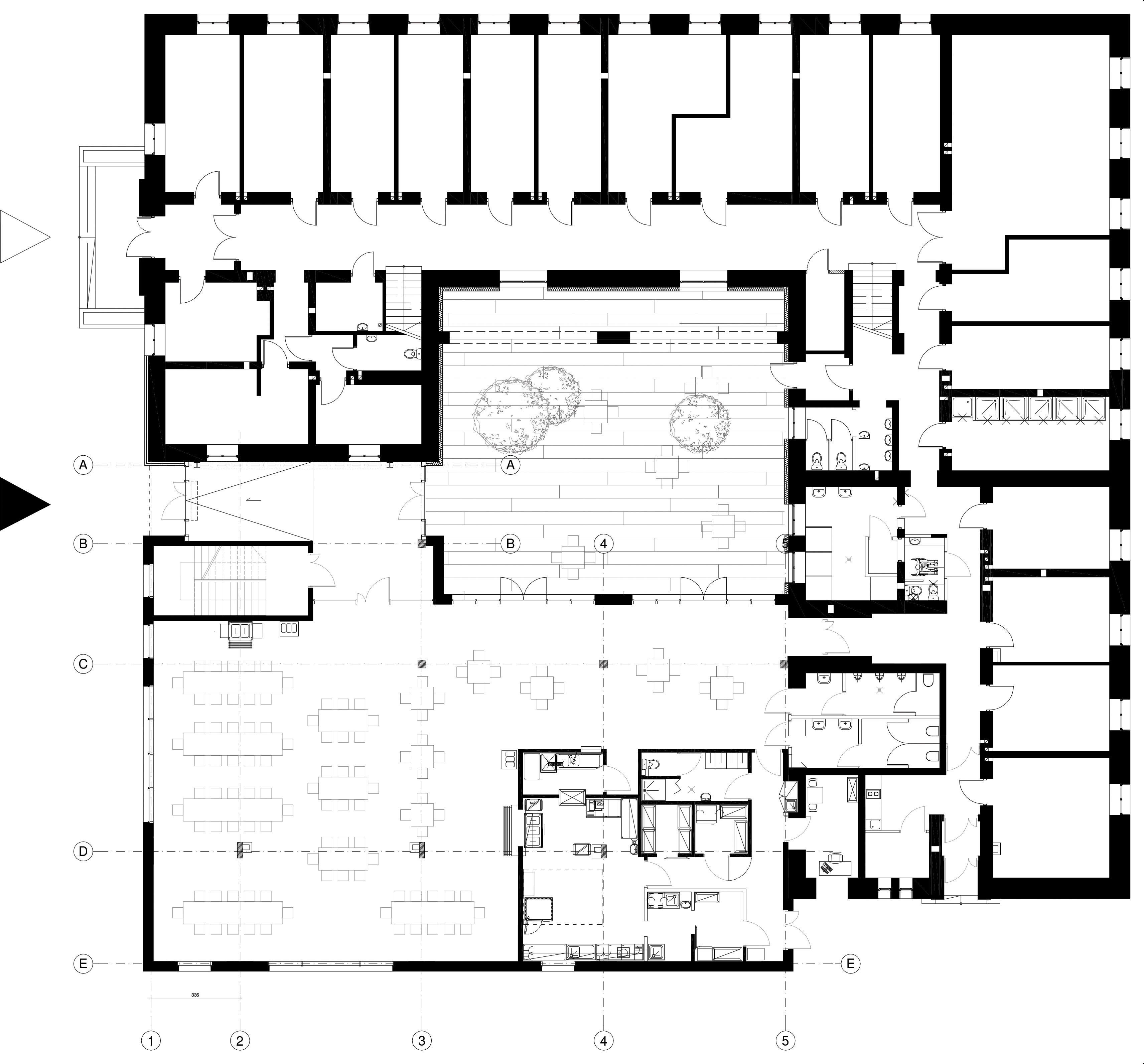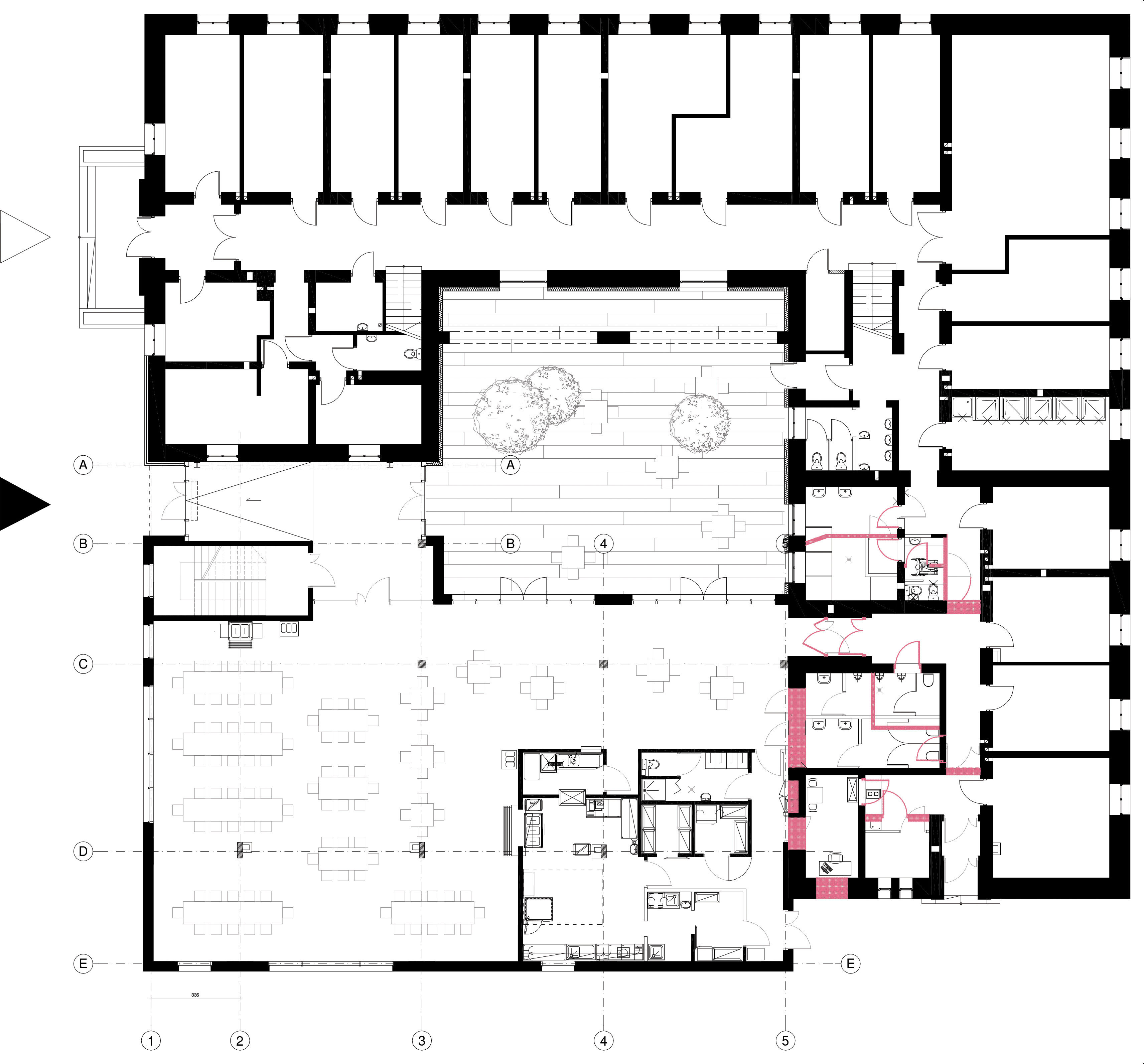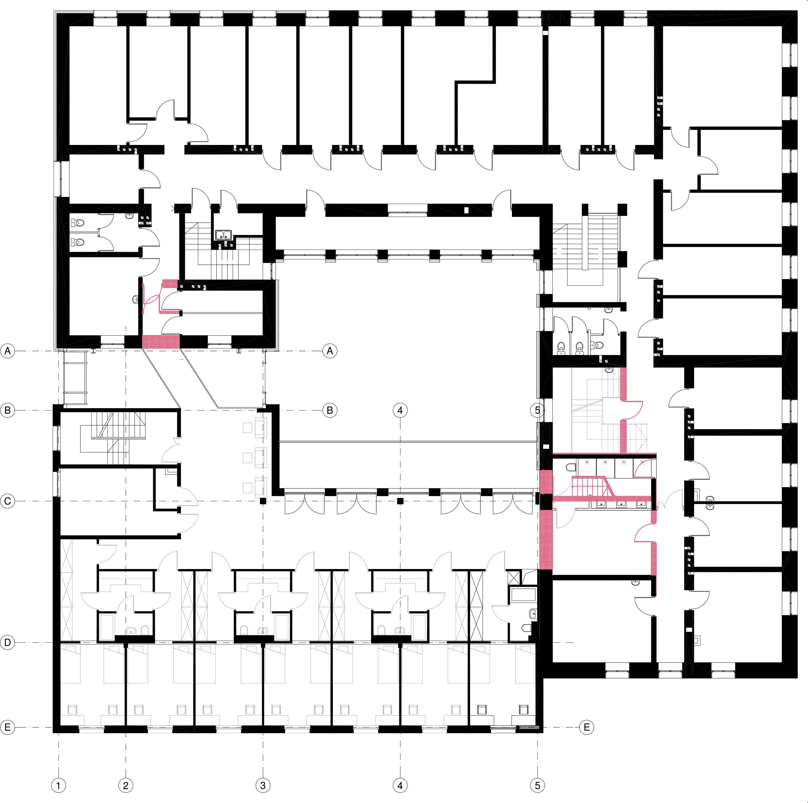 Aby połączyć komunikacyjnie obie części przeprowadzono prace wyburzeniowe wewnątrz budynku oraz w ścianach zewnętrznych w miejscach planowanych przejść. Dodano nową klatkę schodową w części istniejącej z poziomu piętra na poddasze. W przestrzeni szklanego łącznika zaprojektowano stalową ażurową kładkę dzięki, której komunikacja na tym poziomie zyskała pełne połączenie, a jej lekka forma ma za zadanie nie wpływać negatywnie na odbiór wnętrza.
